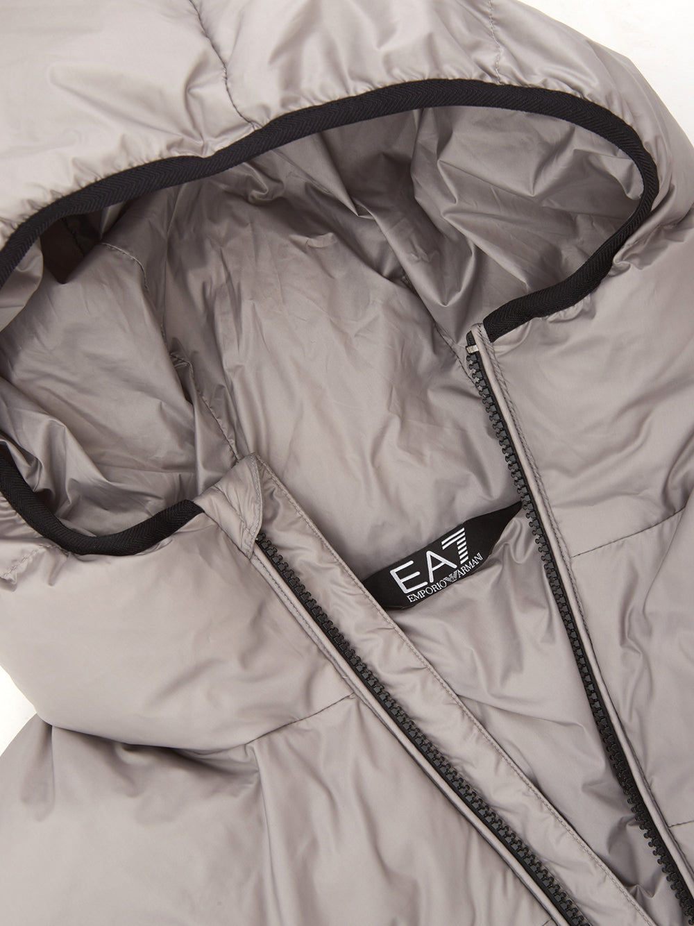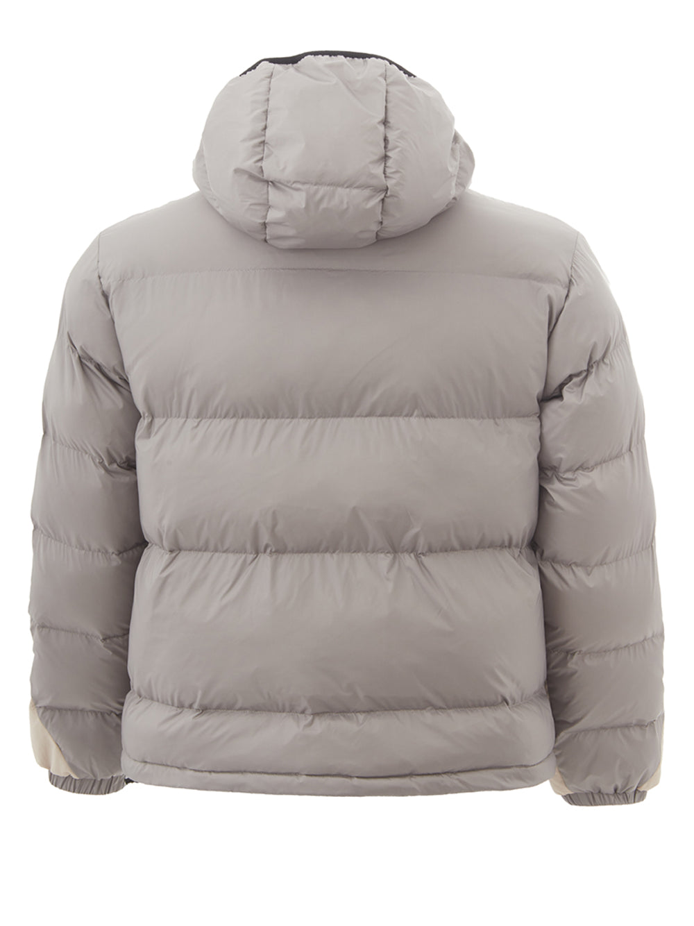 Model: Beige/Grey Quilted Jacket, front zip closure, two maxi zipped pockets, hood, regular fit. Front logo printed